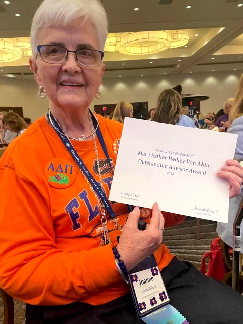 Here are some photos of Tippy celebrating with some fellow advisors and collegians at the Alpha Delta Pi Grand Convention in Orlando last week. Tippy was selected as one of eight winners across the United States for what is called the Van Aiken Advising Award, named for the ADPi who was Tippy's Province Director when Tippy was President of our Chapter during her senior year! Tippy also received a beautiful special pin.